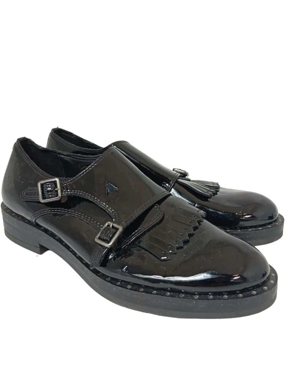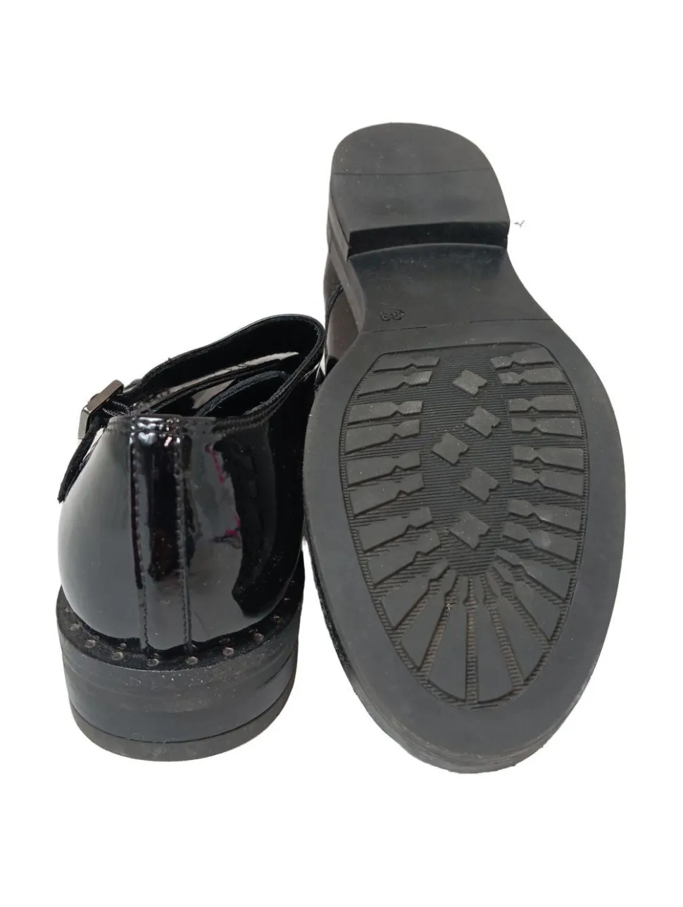- genoppte Laufsohle, runde Schuhspitze, Riemenverschluss, Schnallenverschluss, Casual-Look, Glanz-Optik, Vintage-Look