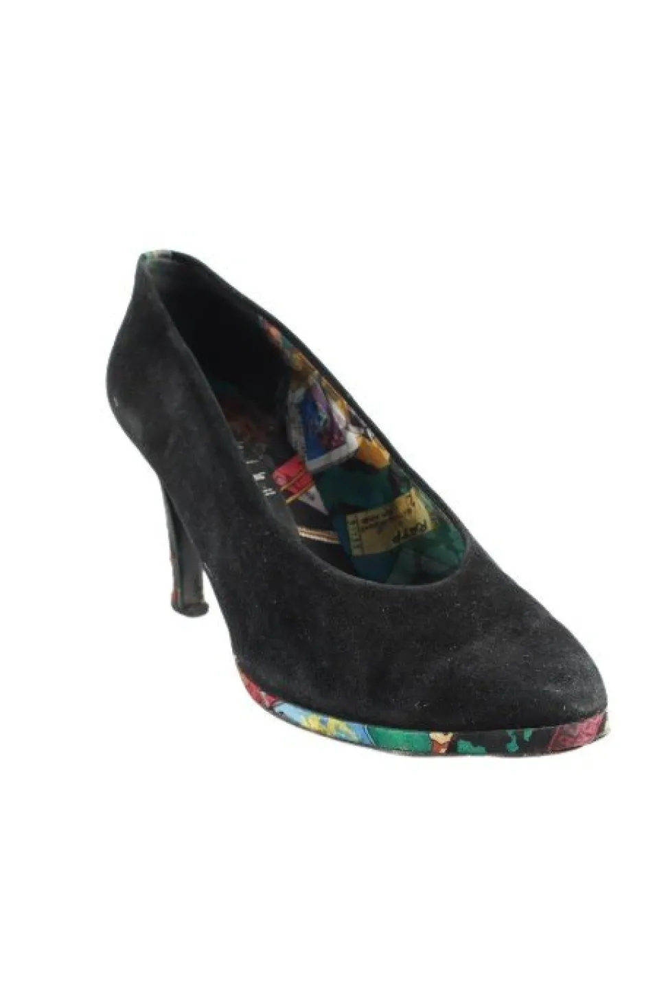 - Pfenningabsatz / Stiletto, bezogener Absatz, glatte Laufsohle, spitze Schuhspitze, Schlupfeinstieg, Motivdruck, extravaganter Stil